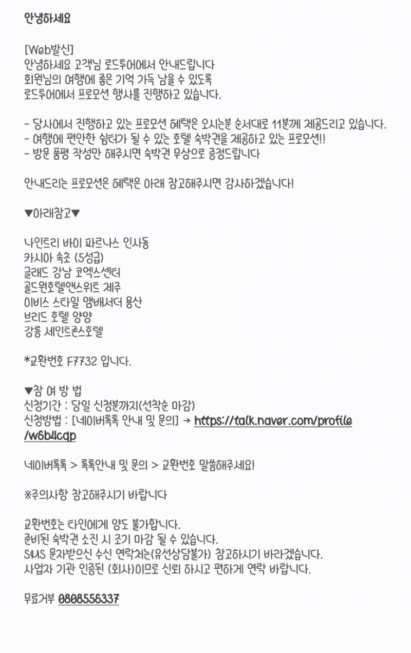 최근 저희 로드투어 여행사를 사칭한 사기행위가 발생하고 있다고 합니다. 저희 주식회사 로드투어는 ' 호텔 숙박권 이벤트 ' 를 진행하지 않습니다.